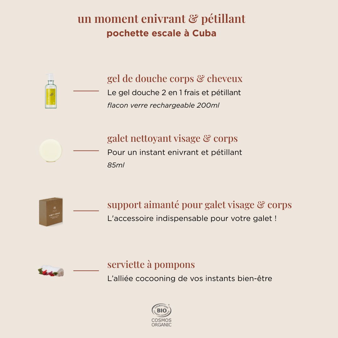 Offrez (ou offrez-vous) un véritable voyage sensoriel entre fraîcheur vivifiante et chaleur ensoleillée avec la pochette escale à Cuba. Un rituel bio complet qui nettoie, hydrate et réveille le corps tout en diffusant un parfum pétillant et envoûtant de menthe, citron et rhum ambré.