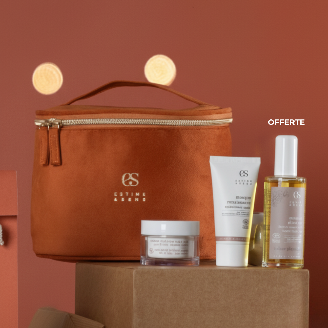 Dans son élégant vanity en velours, découvrez 3 essentiels certifiés bio :