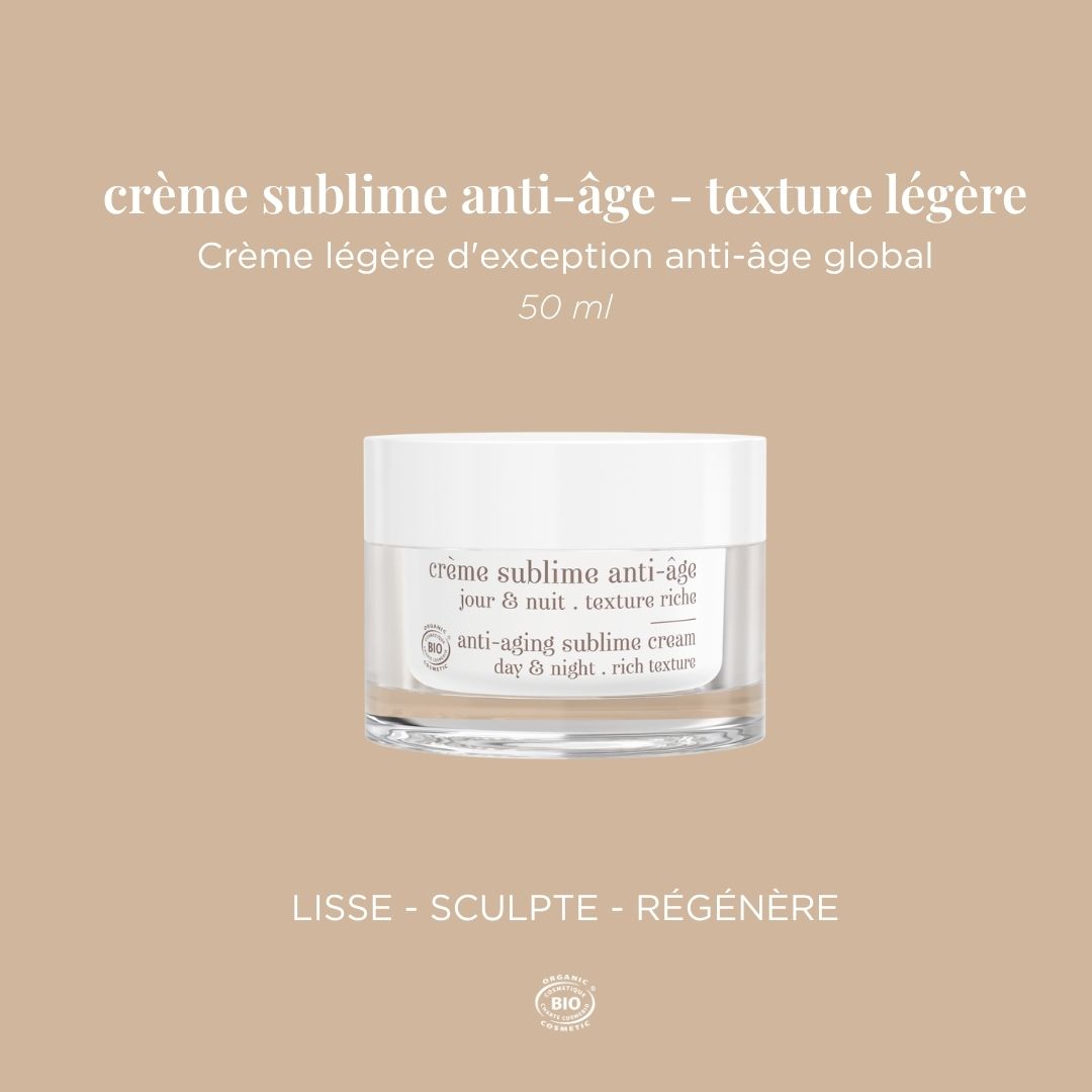 - la crème sublime anti âge texture légère, un soin global jour et nuit à l’action redensifiante et lissante. Elle raffermit et illumine la peau tout en légèreté pour une peau hydratée et repulpée.